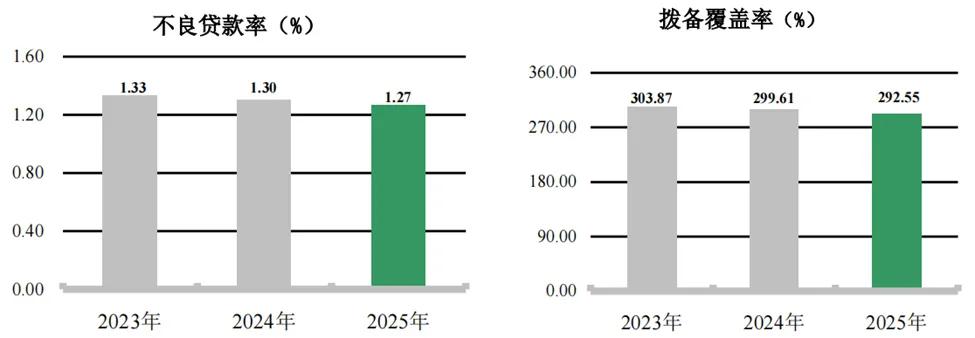 资产质量方面,总体指标保持稳定但内部分化。2025年末,农业银行不良贷款率为1.27%,与三季度末持平,较年初下降3个基点。拨备覆盖率为292.55%,拨贷比为3.71%,虽有所微降,但风险抵补能力依然充足,远高于监管要求,为利润增长留存了反哺空间。
