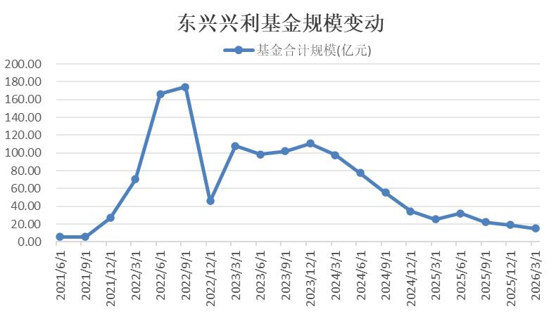最具代表性的是曾经的“网红债基”东兴兴利。其规模在巅峰期2022年三季度末曾达174亿元,而到2026年一季度,已萎缩至15亿元,缩水超九成。