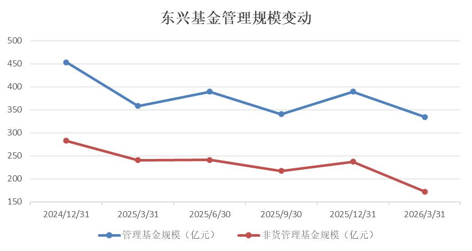 2026年一季度,东兴基金管理规模从2025年初的453.41亿元回落至334.53亿元,降幅达26.22%。当头部公司持续吸金,中小机构普遍面临周期考验与转型压力,东兴基金的这次“波动”,引发市场无数猜测。