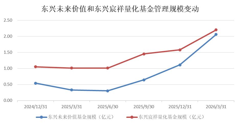 好业绩直接带动份额增长:例如同样表现不错的东兴宸祥量化,该基金2025年初总规模1.05亿份,2026年一季度已增至2.2亿份,增幅超109%。还有东兴未来价值,该基金2025年初总规模0.54亿份,2026年一季度已增至2.06亿份,增幅超280%。