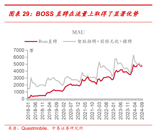 Questmobile数据显示,2024年Q3 BOSS直聘/前程无忧/智联招聘/猎聘平均MAU 分别为4795/1650/2385/889万。