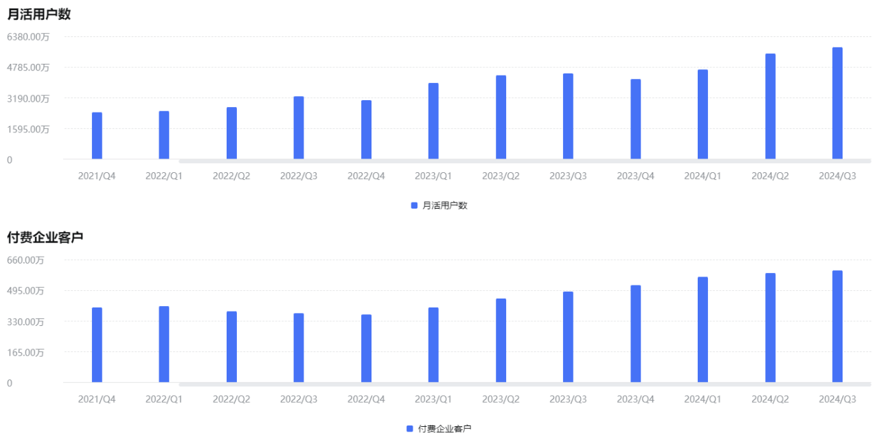 第三季度,BOSS直聘保持了月活用户和付费企业客户的双边增长。公司APP端平均月活用户(MAU)规模为5800万,同比增长30%;截至2024年9月30日止的12个月内,向公司付费的企业客户数达到600万,同比上涨22.4%。