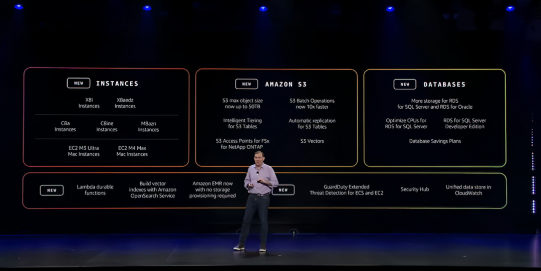 在2025亚马逊云科技re:Invent上,一组数据证明,亚马逊云科技正以积极的姿态备战这个海量Agent时代,其全球数据中心网络已扩展至38个区域、120个可用区,并在过去一年新增了38GW的数据中心容量,在过去12个月中增加了50%。此外,Matt Garman还在演讲的最后,一口气发布了25项云核心服务创新,覆盖计算、存储、数据库等领域。