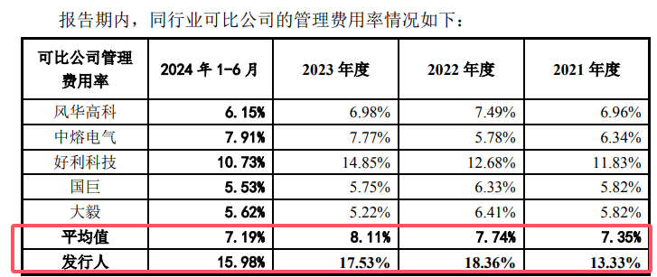2021年至2024年1-6月,钧崴电子管理费用分别为7499.37万元、10,018.90 万元、9889.18 万元和4854.28万元,占当期营业收入的比重分别为13.33%、18.36%、17.53%和15.98%。而同期可比同行管理费用占比均值为7.35%、7.74%、8.11%、7.19%。