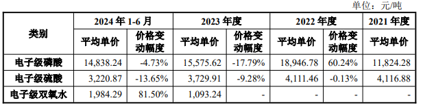根据显示2021年至2024 年 1-6 月,兴福电子电子级磷酸平均销售单价为1.18万元/吨、1.89万元/吨、1.56万元/吨和1.48万元/吨,价格变动幅度为60.24%、-17.79%和-4.73%。电子级硫酸平均销售单价为0.41万元/吨、0.41万元/吨、0.37万元/吨和0.32万元/吨,价格变动幅度为-0.13%、-9.28%和-13.65%。