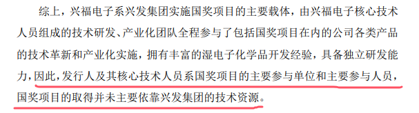兴福电子的回复可以说是无敌了,公司解释称核心技术人员李少平,为本项目牵头人,为国奖项目的主要参与单位和主要参与人员,并且称国奖项目的取得并未主要依靠兴发集团的技术资源。