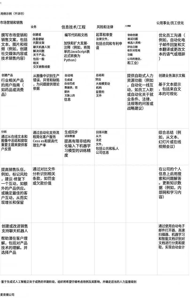 下面这张图片来自麦肯锡,它为生成式AI的使用场景做了很好的分类与总结。