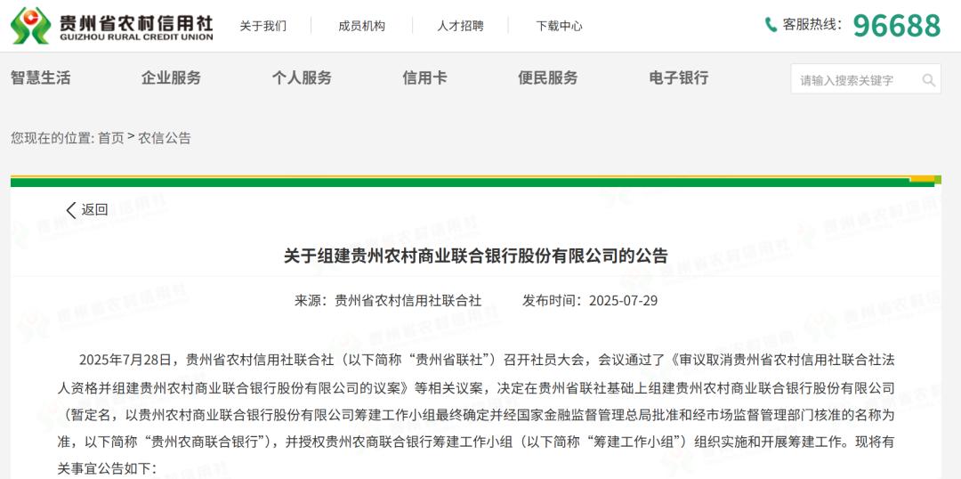 7月29日,贵州农信社官网发布公告称,贵州省联社日前召开社员大会,决定在贵州省联社基础上组建贵州农村商业联合银行股份有限公司(暂定名,下称“贵州农商联合银行”)。