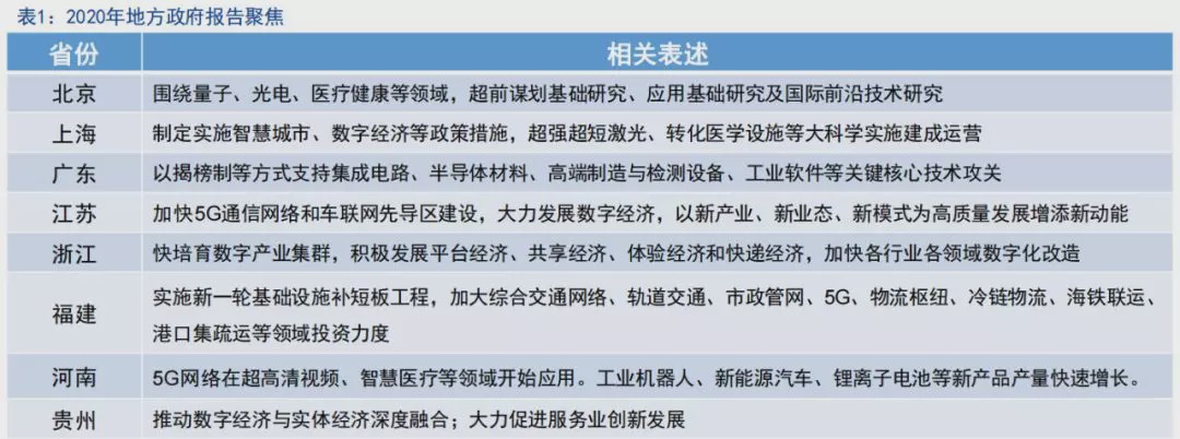 今年年初以来,地方两会密集召开,多地的2020年政府工作报告在基建投资方面更加偏 向“新基建”领域.我国正处在经济从高速增长转向高质量发展的阶段,地方政府以消费和有效投资带动各行业均 衡发展、全面升级已成为必然路径。