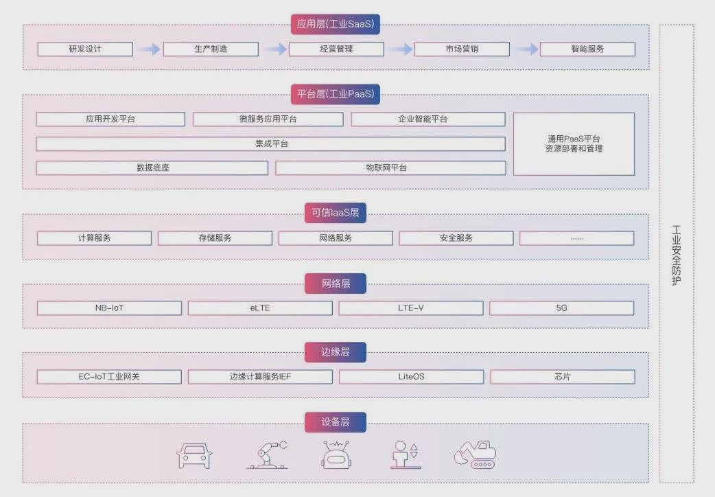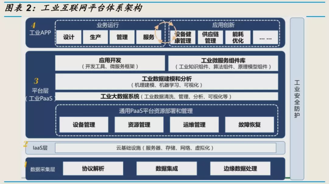 工业互联网平台本质是一个工业操作系统,其功能类似于微软的 Windows、 谷歌的安卓系统以及苹果的 iOS 系统。向上提供开发接口及存储计算、工 具资源等支持,向下实现对各种软硬件资源的接入、控制和管理。工业互 联网平台由边缘层、IaaS 层、PaaS 层及应用层构成。边缘层是基础,向 下接入工业设备实现数据的采集与处理。工业 PaaS 层是核心,基于通用 PaaS 并融合多种创新功能,将工业机理沉淀为模型,实现数据的深度分 析并为 SaaS 层提供开发环境,是平台核心能力的集中体现。应用层是关 键,主要提供覆盖不同行业,不同领域的业务应用及创新性应用,形成工 业互联网平台的最终价值。
