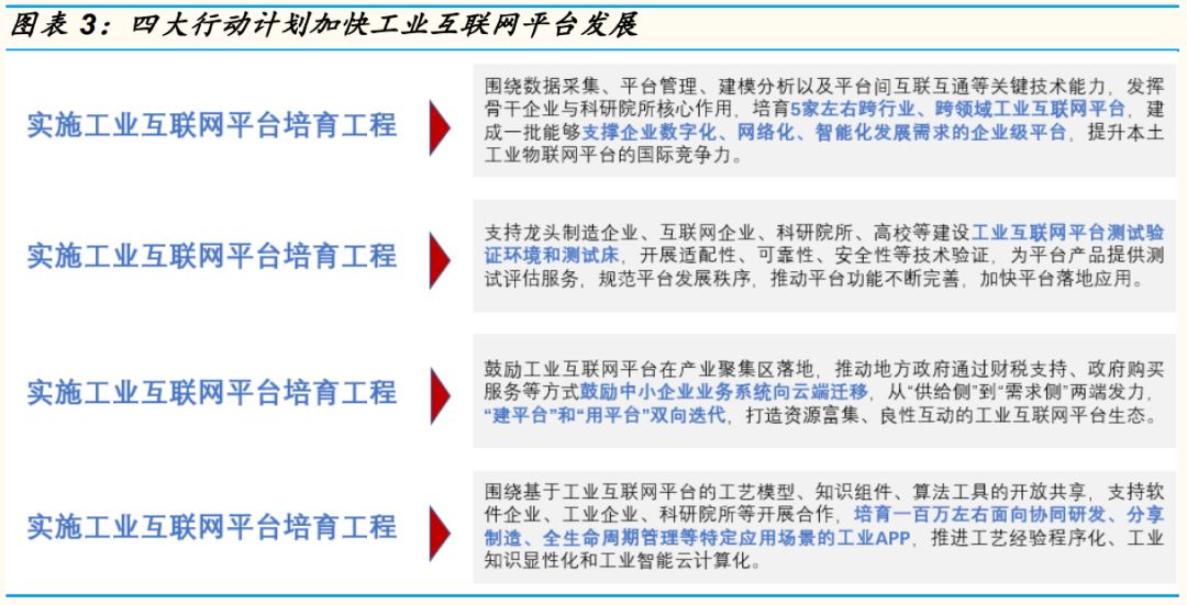 根据指导意见,国家主要从四个方面加速工业互联网平台发展:实施百万 工业企业上云工程、实施工业互联网平台实验验证、开展工业互联网平台 实验验证、实施百万工业 APP 培育工程。