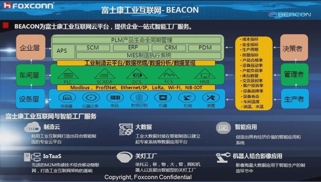 富士康 BEACON 工业互联网平台:EACON 以 C2C(Component To Consumer)为主轴,打通全供应链的各个环节,为企业创新价值,以 关键、有效、微观、纳米的数据采集为基础,从 Data Hub、Data Warehouse、Data Supermarket 到平台开发、微服务应用整合进行了 一系列观念与技术的创新,达到提质、增效、降本、减存的效果。