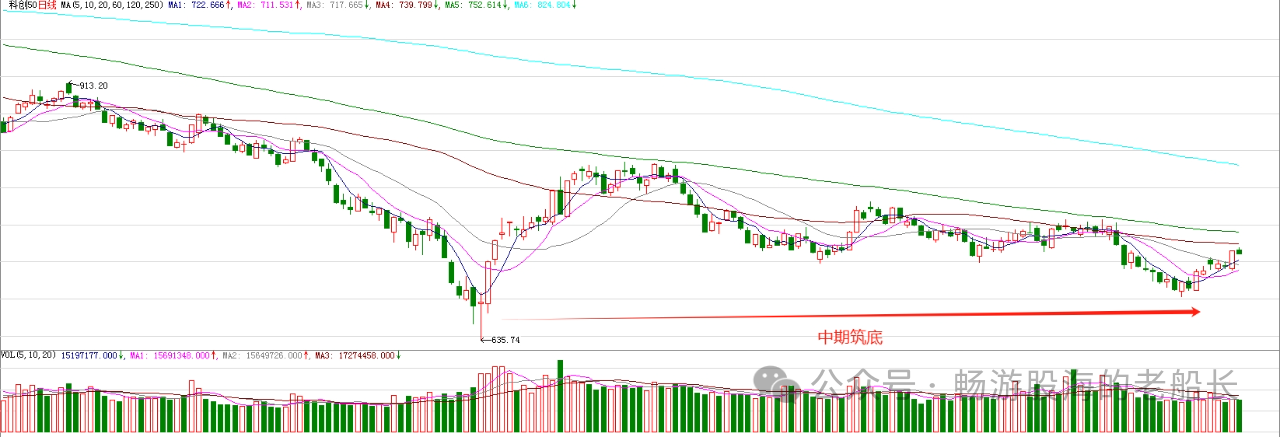 图中标注很清楚,围绕半年线,日线级别构筑了一个比较大型的潜在中期筑底形态,由于半年线和六十日均线粘合且走平,所以科创50指数修复是最彻底的。只要最近有效站稳半年线,中期底部就突破了。接下来几个交易日,突破是大概率事件。