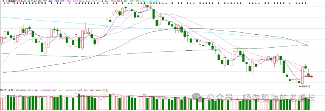 上证指数,在昨天分析中,本人指出了今天大概率会调整到五日均线,今天走势基本符合预期。收盘来看,K线带有比较大的向下跳空缺口,阴线实体小,下影线短,上影线比较长。这样的K线,估计99%以上的散户朋友都会解读很悲观,认为大盘指数下周还会继续下跌。但是大盘指数总是充满迷惑性,多数人只能看到表面现象,看不到盘面的本质。今天的K线如何解读?