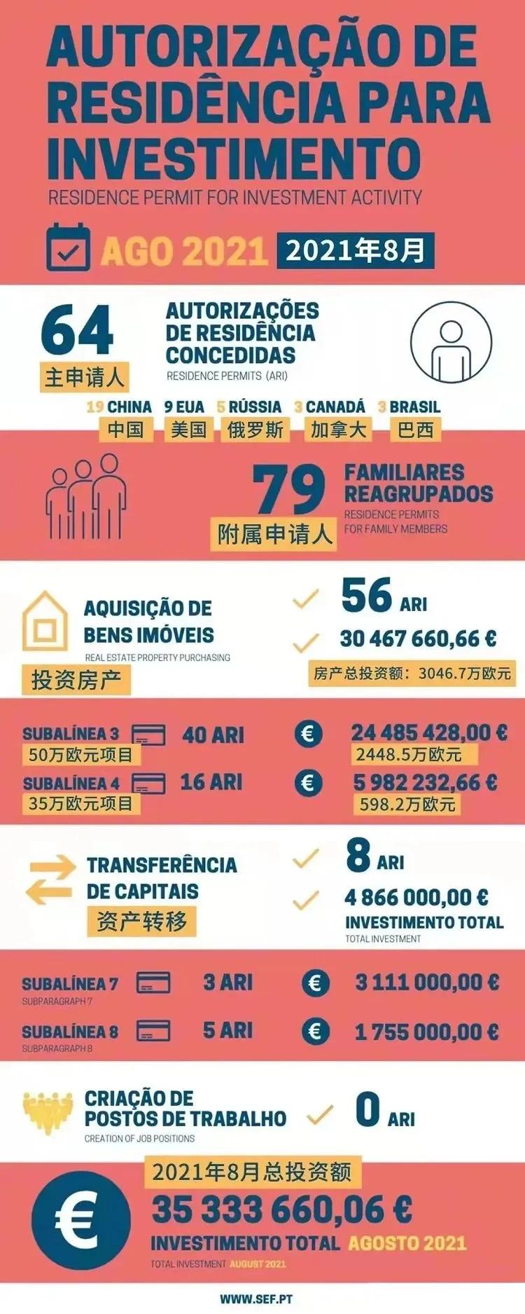 近日,葡萄牙移民局发布了最新黄金签证数据:8月,葡萄牙黄金签证的总投资超过了3533.3万欧元,共计64位主申请人携79位家属获批。中国主申请人为19人,依旧排名第一。其次是美国(9人)、俄罗斯(5人)、加拿大(3人)以及巴西(3人)。64位投资人中,有56位不约而同选择了房产投资,8位选择了基金投资。