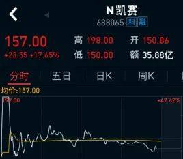 4、需要特别提醒大家的是,见上图,昨日上市的N凯赛即凯赛生物,开盘只涨13%,收盘也只涨17.65%!凯赛生物也是高发行价,发行价为133.45元,中签者昨卖出只赚万元上下,还不知今日是涨还是跌呢!