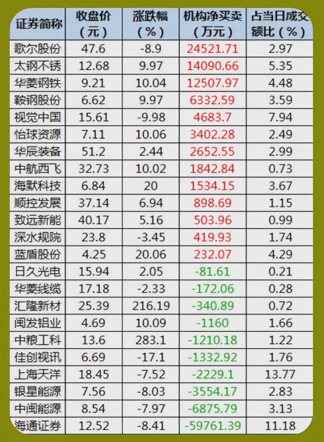 盘后龙虎榜数据显示,昨日机构席位资金合计净卖出约3095.01万元。其中净买入的个股13只,净卖出的个股10只。