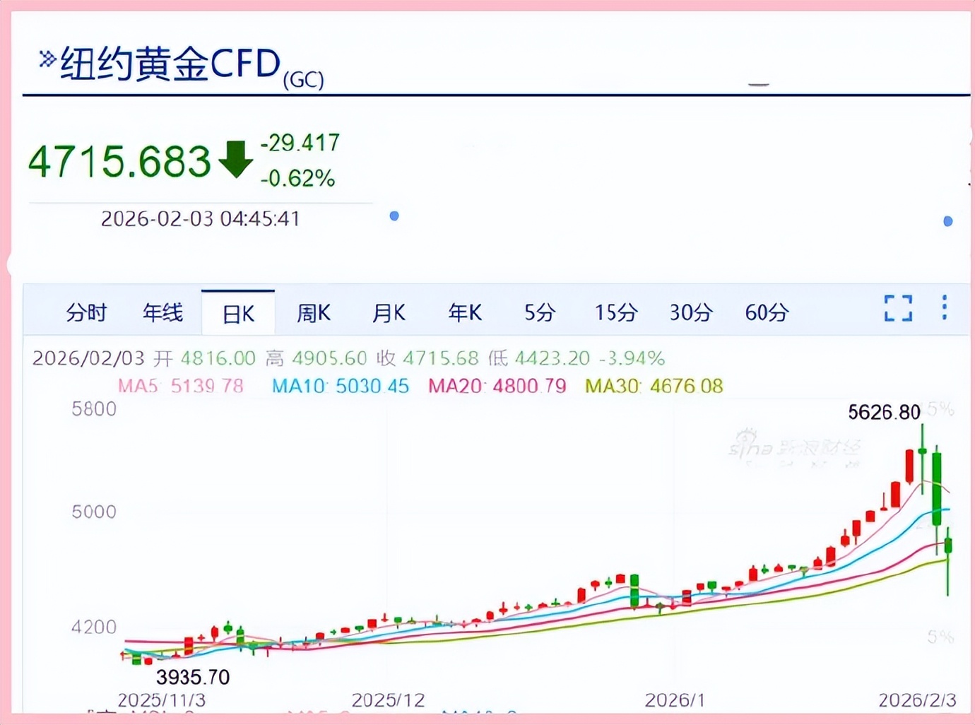 纽约黄金每盎司最低4423美元,最大跌幅近7%,已返身向上300美元,跌幅大幅收窄至0.80%!