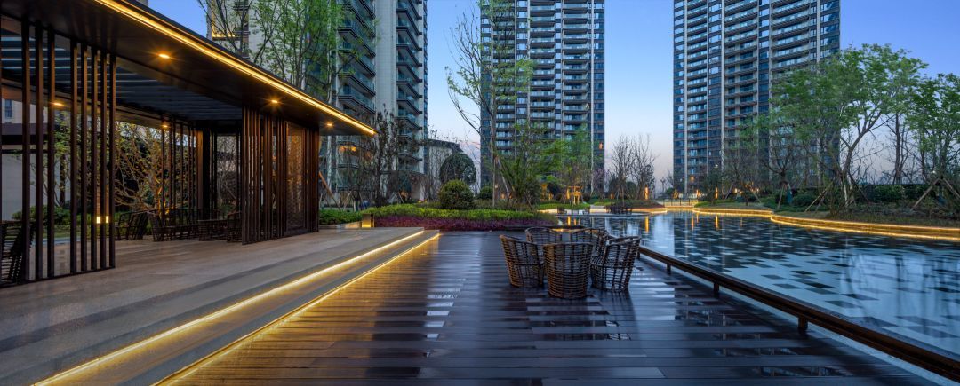 园林景观则由方兴金茂府系、泰禾大院系的御用景观公司操刀。高层区园林景观运用写意山水手法,融合蜀贵府邸的规制,打造西苑十景,规划“三进三堂”入户体验,居住者能够在此感受高规格院落规制及身份认同。