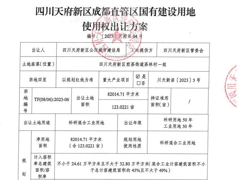 成都市公共资源交易服务中心发布的成交公告显示,这宗土地位于四川天府新区煎茶街道茶林村一组,面积约123.02亩,容积率约4.0(计容建筑面积不大于32.80万平米),为科研混合工业用地,竞得者为凤栖创造(四川)建设发展有限公司(简称凤栖创造),成交楼面价125万元/亩,为底价成交。