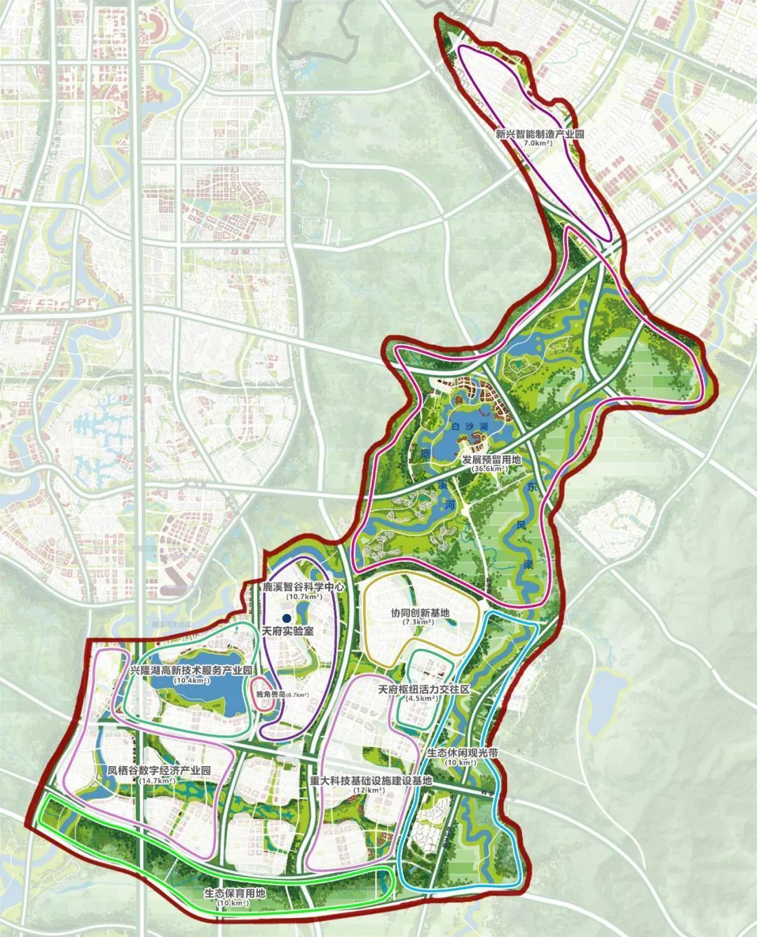 根据官方介绍,鹿溪智谷科学中心规划面积10.7平方公里,集中布局中科院、中物院等国家级科研机构;兴隆湖高新技术服务产业园规划面积10.4平方公里,布局新经济产业园、央企研发中心和校院地协同创新区;凤栖谷数字经济产业园规划面积14.7平方公里,布局天府无线谷、凤栖软件园等数字经济产业园区。