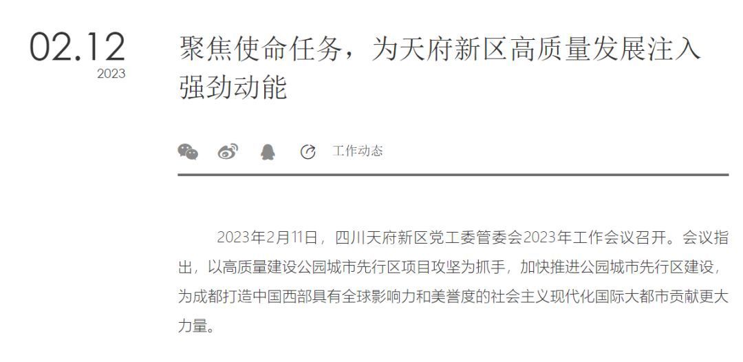 2023年2月11日,四川天府新区党工委管委会2023年工作会议召开。会议指出,以高质量建设公园城市先行区项目攻坚为抓手,加快推进公园城市先行区建设,为成都打造中国西部具有全球影响力和美誉度的社会主义现代化国际大都市贡献更大力量。