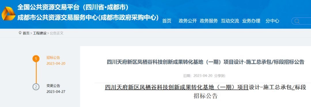四川天府新区凤栖谷科技创新成果转化基地多项招投标信息则显示,项目位于天府新区成都科学城凤栖湿地,已从2023年3月开始,快速启动项目的勘察、施工总承包、监理等多项招投标,采购人均为凤栖创造。