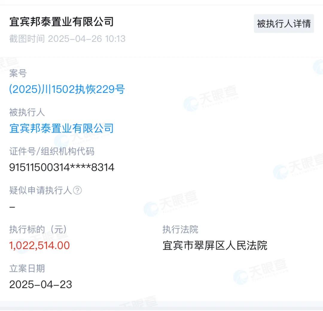 据氢地产监控,日前,宜宾邦泰置业有限公司(以下简称宜宾邦泰)发生高风险信息,其被列为被执行人,涉及案号(2025)川1502执恢229号。