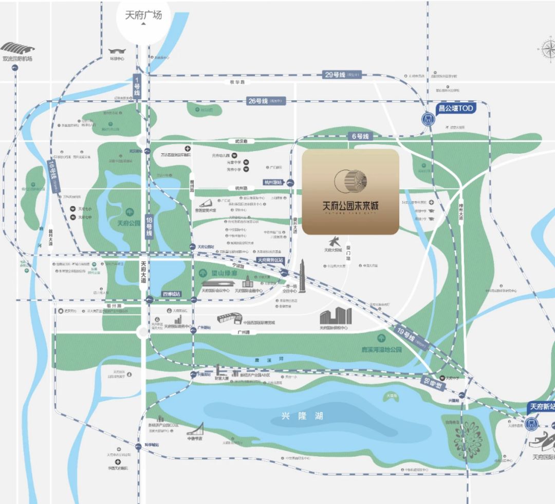 以天投·天府公园未来城为核心,能够看到丰沛的各类配套:碳汇绿廊、鹿溪河生态区与天府公园构筑着生态基底,而一带一路大厦、天府国际金融中心、天府国际会议中心等鳞次栉比的城市地标则在构筑着“未来新中心”的封面感,同时,它毗邻天府大悦城、地铁6号线杭州路站、一街之隔是规划的小学、中学,区域内还有元音小学、元音中学等学校……云集全城头部配套。