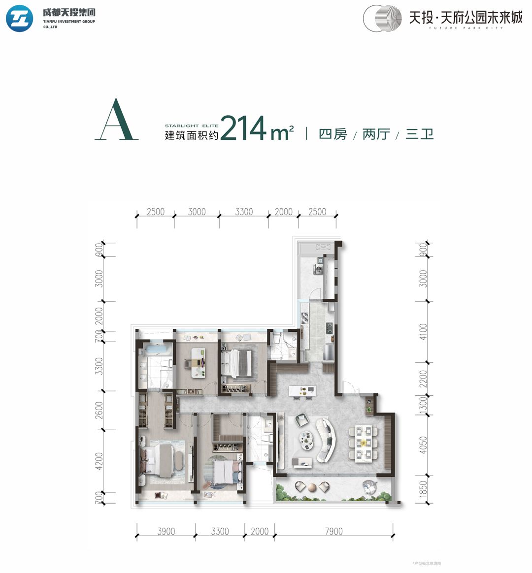 ◎ 天投·天府公园未来城星萃组团建面约214m²户型图,非交付标准