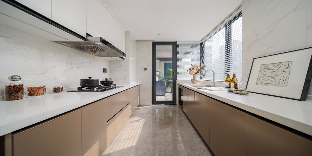 预留了建面约10㎡的西厨空间,中厨连通生活阳台,每一个功能场景的空间都很足,完全满足了壕宅的生活想象。