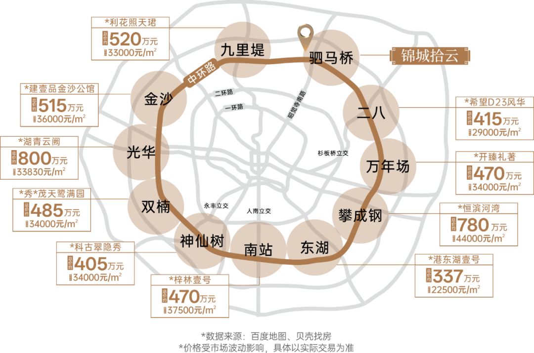 项目位于新北天地商贸区的昭觉寺·动物园商圈,它也恰好在黄金中环的范围内。自2022年提出黄金中环范围,成华区的价值跃升都是围绕这一线路展开。在我们上述统计的表格中,有8宗土地都是位于黄金中环上。高土地价值,也带动了区域房价的走高,目前,黄金中环上的新房单价已经来到3.5万元/㎡。