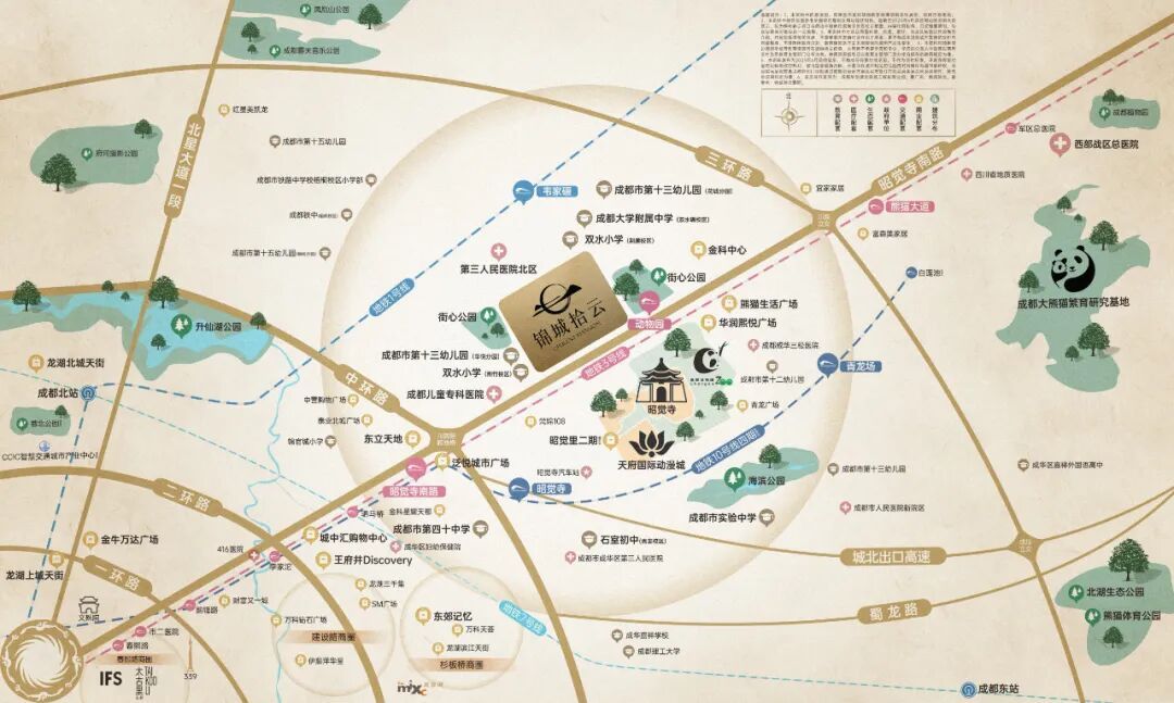 首先是它的坐标C位。锦城拾云位于地铁3号线动物园站旁,这种轨道交通的优势,让它仅需7个站,就抵达城市中心;而周边的熊猫生活广场、华润熙悦广场、泛悦mall等商业已经足够承接未来的区域生活;海滨公园、沙河公园、成都露天音乐公园,叠加项目楼下的南北双街心公园,则构成了主城极其稀缺的生态绿肺;与此同时,它同时接驳着三大城市IP:昭觉寺、成都动物园、天府国际动漫城,三大地标,让这里既有城市的文化底蕴,也有年轻的活力。