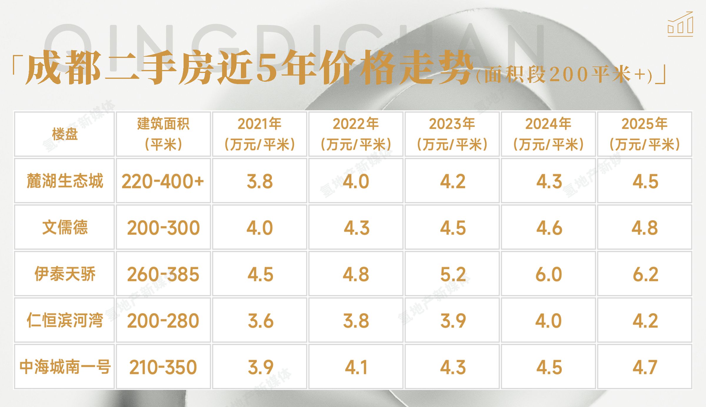 毫无疑问,楼市已进入新阶段,诸多二手房出现评估价的下行,诸多新壕宅又来到千万+新高。如果仔细分析,二手房、新壕宅也有共同的趋势:二手房之中,200平米以上大户型呈现稳健涨势,呈现宏观下行背景之中的抗跌特质;新壕宅之中,同样以大户型为主。先来看成都二手房(面积段200平米+)近5年价格走势——