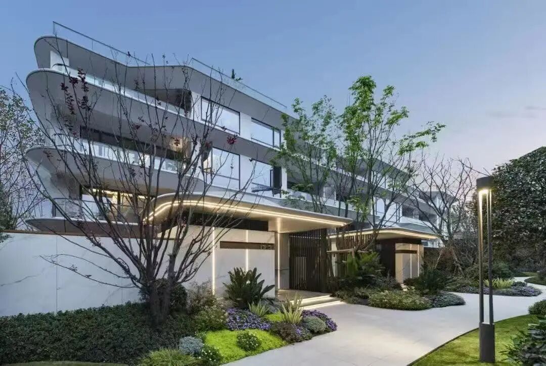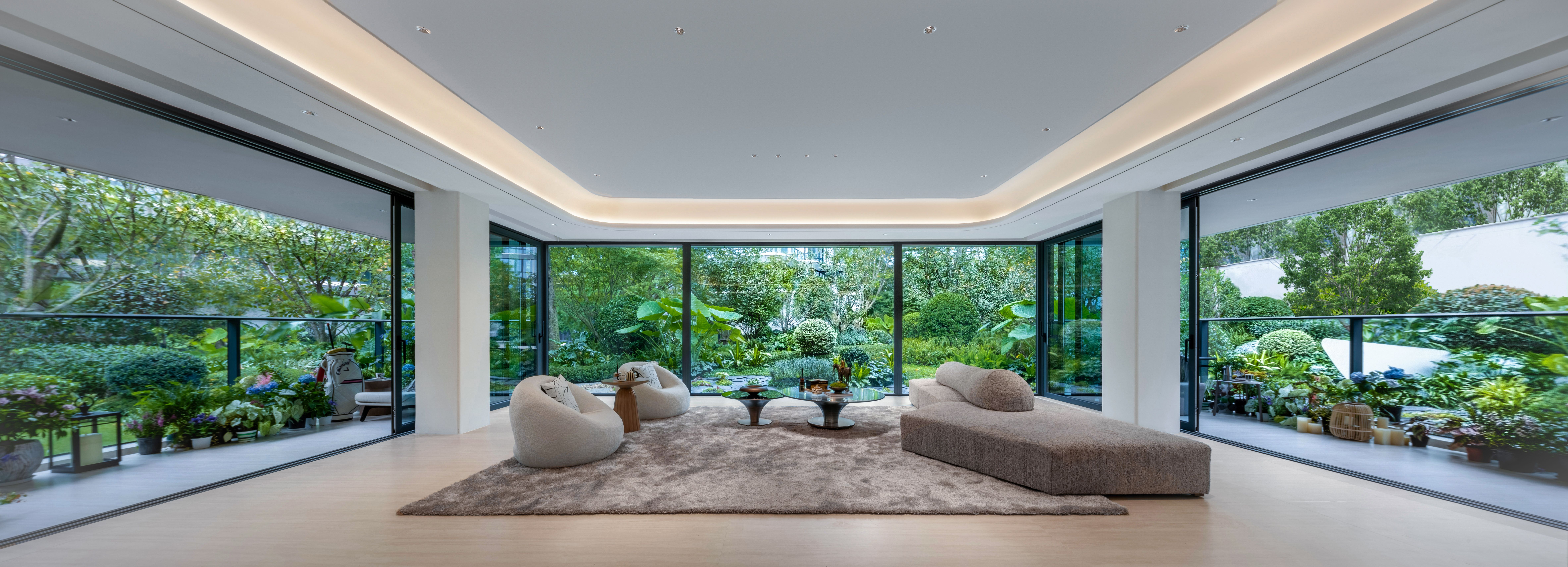 采用这种布局之后,花园排布于客厅左右,形成比翼双飞之势,不影响客厅采光,让景观直入眼帘,还增加了客厅的尺度感,可以走出客厅,步入双侧花园,超过四代宅的空间体验;不再有左右、楼上楼下对视问题,隐私度提升;主立面为玻璃立面,公建化立面具有统一性、高端性、实用性,没有了四代宅绿植化立面的后期维护难题,且无惧极端暴雨天气影响。
