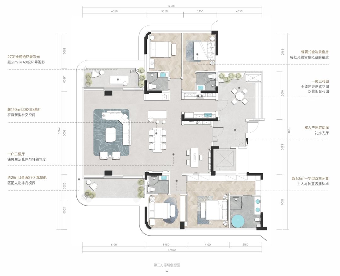 首先,一房三横厅+双端翼花园,形成步入即震憾的强烈冲击。三个横厅可根据需求“三合一”,也可以功能分区,实现个性化需求,再加上双端翼花园的空间拓展,构建市面独一无二的端翼超厅,建面约227平米大平层,实现空间体验的连续跃升,拥有建面约300平米顶壕的步入感。