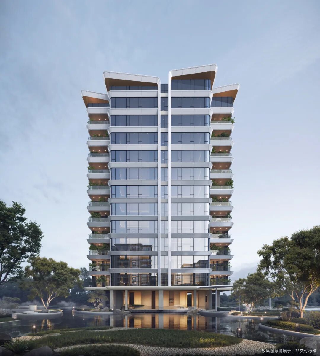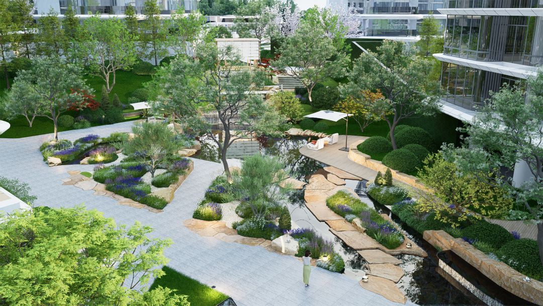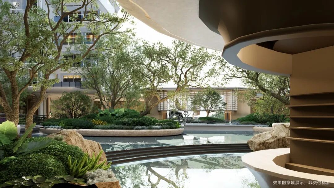 2024年,项目迎来交付,赢得了约100%的业主交付好评。漫步其中,穿过水景和精心养护绿植,看见住宅外立面的高阶与大气,就认同了项目品质。