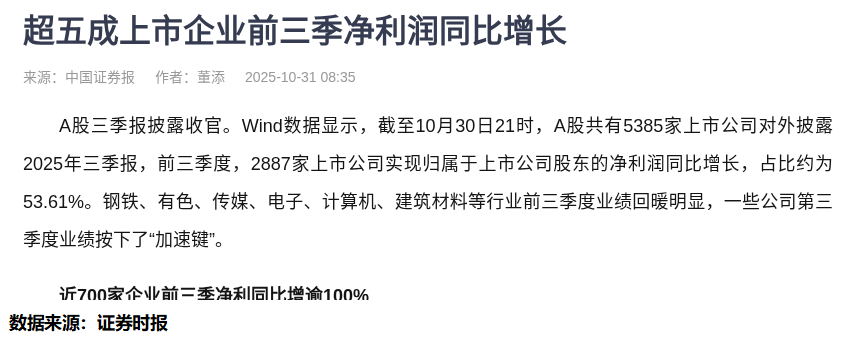 2025年A股三季报披露收官,5385家上市公司中53.61%的企业净利润同比增长,677家公司增速超100%,更有先达股份、方正电机等企业增速突破3000%。钢铁、有色、传媒等行业表现尤为突出。