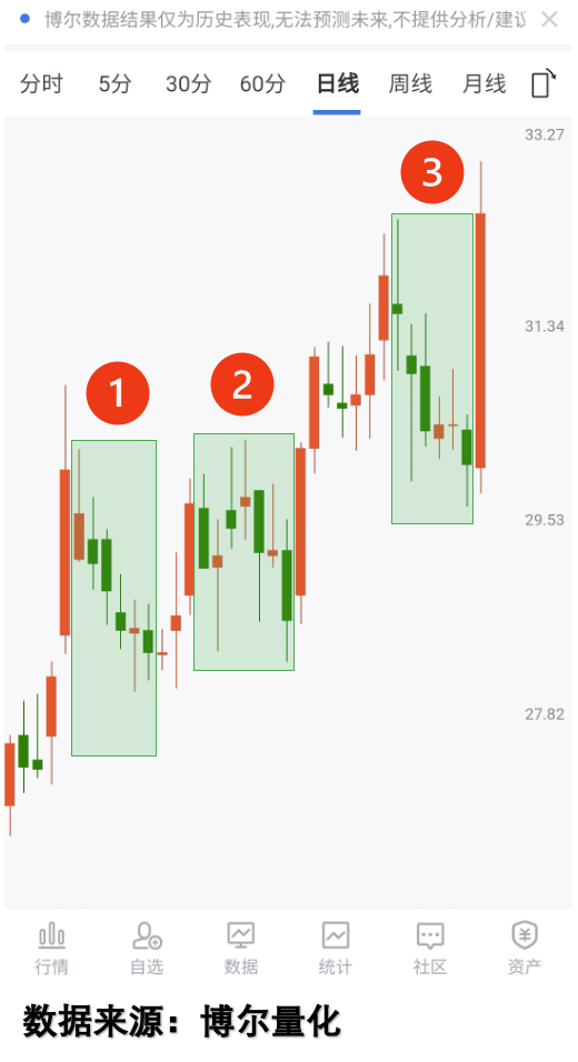 用数字标出的三个区域调整幅度都不小。"事不过三"的心理作用下,多少人在区域①就缴械投降?更别说区域③接近破位的走势。但真相是:这些调整都是机构精心设计的陷阱。