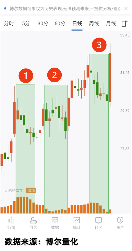 图中橙色柱体是反映机构资金活跃度的「机构库存」数据。虽然股价跌宕起伏,但三个区域的「机构库存」始终存在——说明机构一直在积极参与。试想:如果真不看好,机构为何越跌越买?