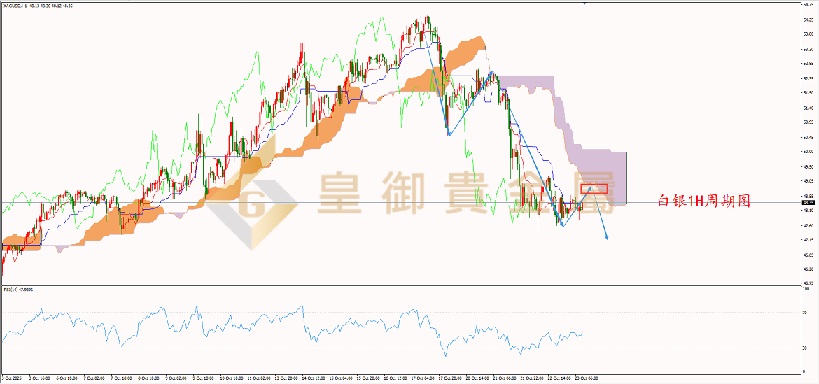 从1小时周期走势结构看,白银当前低位弱势震荡,昨日未能进行有效反攻,当前需要重点留意行情再度下破可能。当前1小时级别一目均衡表指标转折线下破基准线,延迟线处于K线下方,云层为厚重空头云,显示出空头信号,今日可重点关注48.95一带可能的做空机会,以及下破低点空头加速可能。