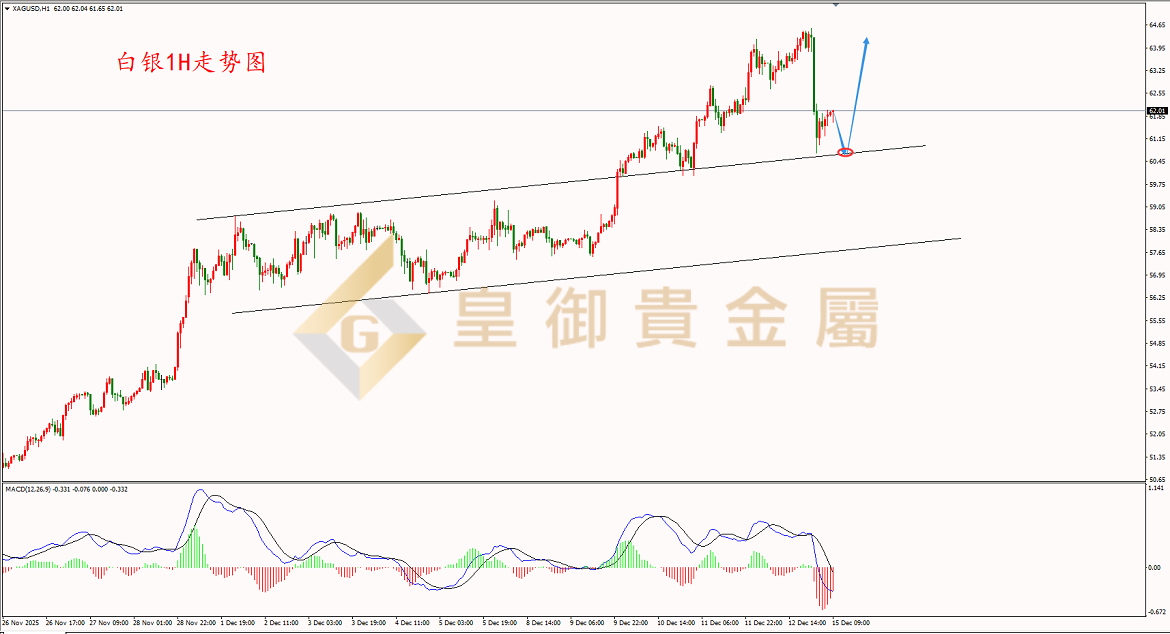 从1H周期走势结构看,白银强势突破上升通道上轨阻力,并回踏上轨加速上行,目前价格二次回踩通道上轨,但并未跌破此支撑,表明上涨形态运行良好,可等回踩通道支撑做多机会。指标MACD显示,双线往下跌破零轴,处于死叉往下,预示短线回调概率较大,因此可以等待价格回调后,考虑顺势逢低做多。