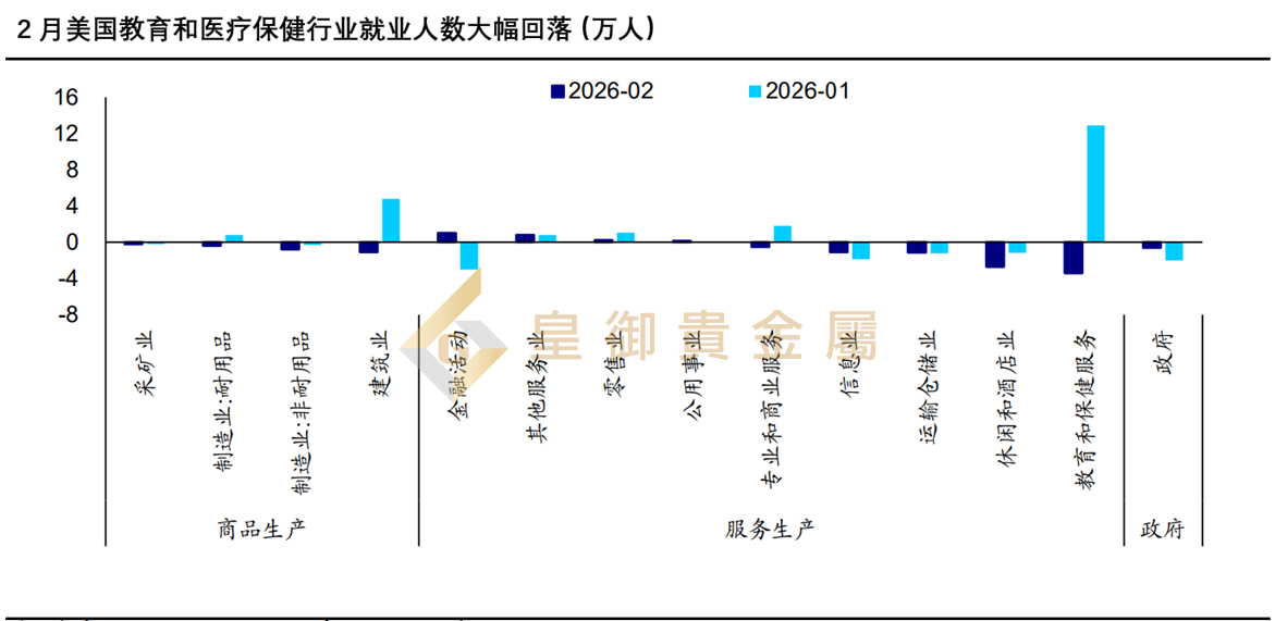 3月6日美国劳工统计局数据显示,2月非农就业人口净减少9.2万,失业率由1月的4.3%升至4.4%,高于预期4.3%。本次非农新增由正转负,核心拖累主要有两点:一是大规模罢工直接冲击,凯撒医疗集团约3.1万员工罢工,导致教育和保健服务部门减少3.4万人;二是极端寒潮天气阶段性影响户外及敏感行业,2月初美国多地遭遇强寒潮与暴风雪,拖累建筑、休闲酒店、交运等行业合计减少约4.9万人。