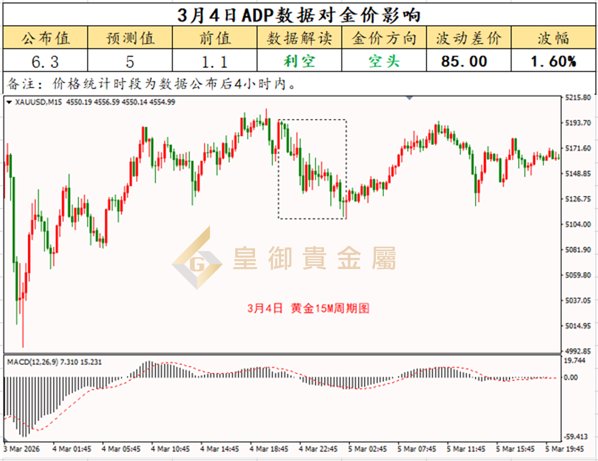 3月4日公布的ADP就业人数新增6.3万人,高于前值1.1万人和市场预期5.0万,利空黄金。数据公布后,黄金震荡下跌,跌幅近85美金。