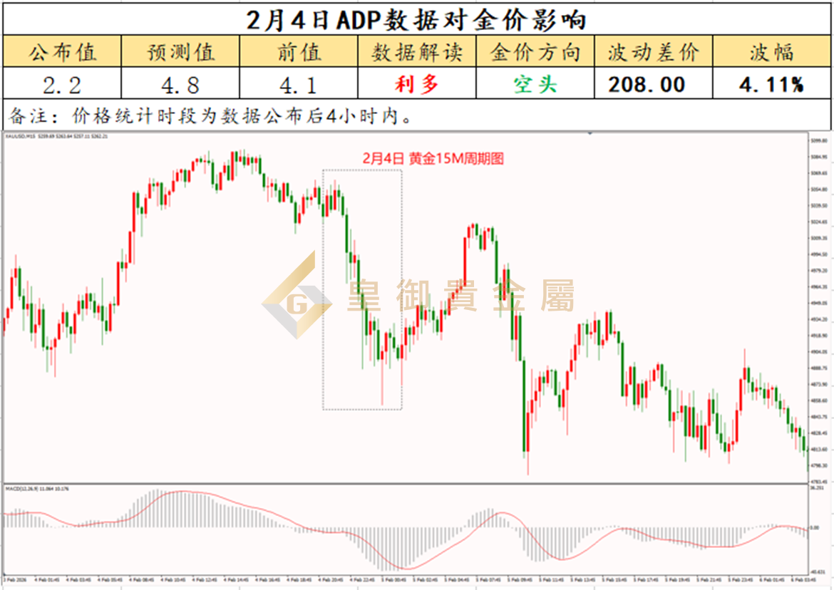 2月4日公布的ADP就业人数新增2.2万人,低于前值4.1万人和市场预期4.8万,利多黄金。数据公布后,黄金短线走强后转为下跌,跌幅近208美金。