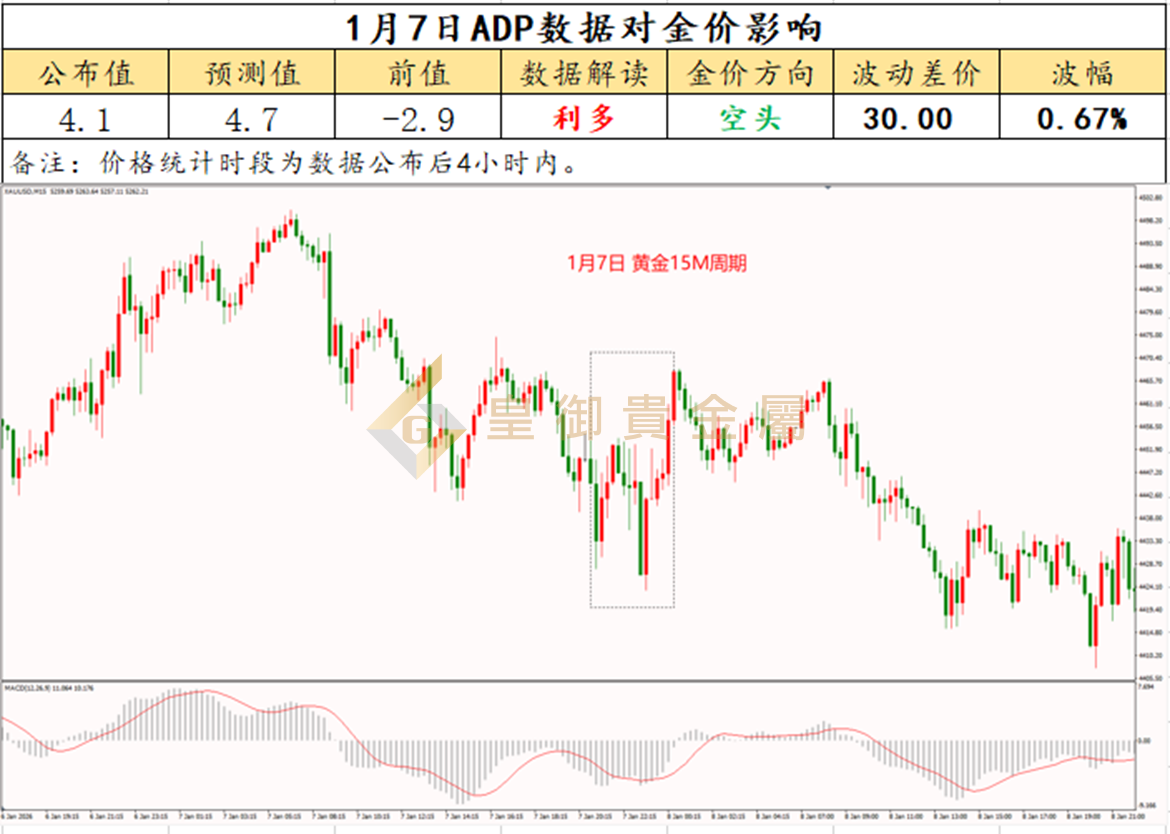 1月7日公布的ADP就业人数新增4.1万人,高于前值的-2.9万人,低于市场预期的4.7万人,利多黄金。数据公布后,黄金冲高回落,短线下跌近30美金。