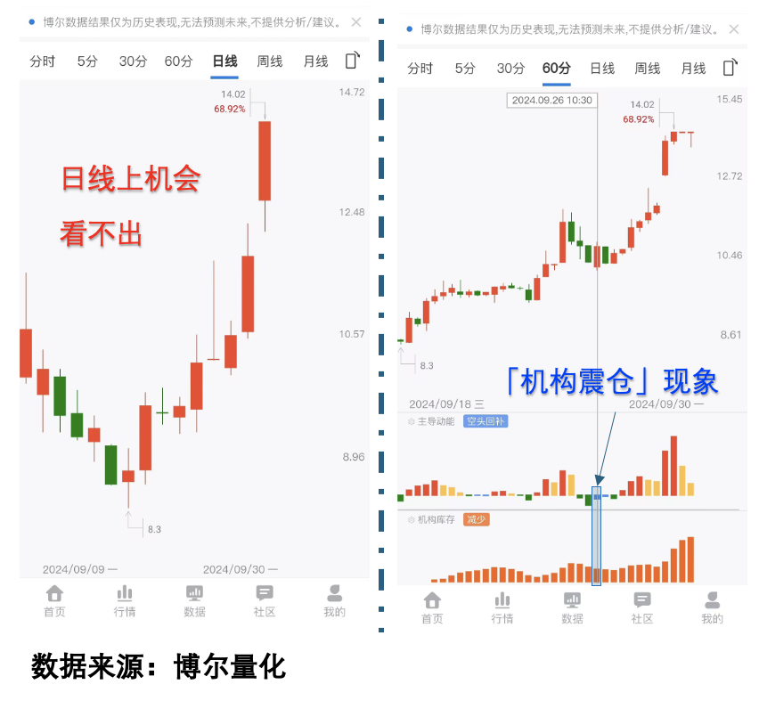 这分别是「东方国信」和「飞天诚信」两只个股的走势图和「交易行为数据图」,从图中不难看出,日线上股价都是连续多日拉出阳线,几乎没有好的上车机会,但实际看数据的话,会发现柳暗花明又一村!这就是当下机构的玩法,「震仓」这种行为,不管是什么时候,都不会过时,毕竟机构要用「震仓」来测下水温,才知道如何操作,但起码我们知道机构有想法了,总比大海捞针来得强得多!
