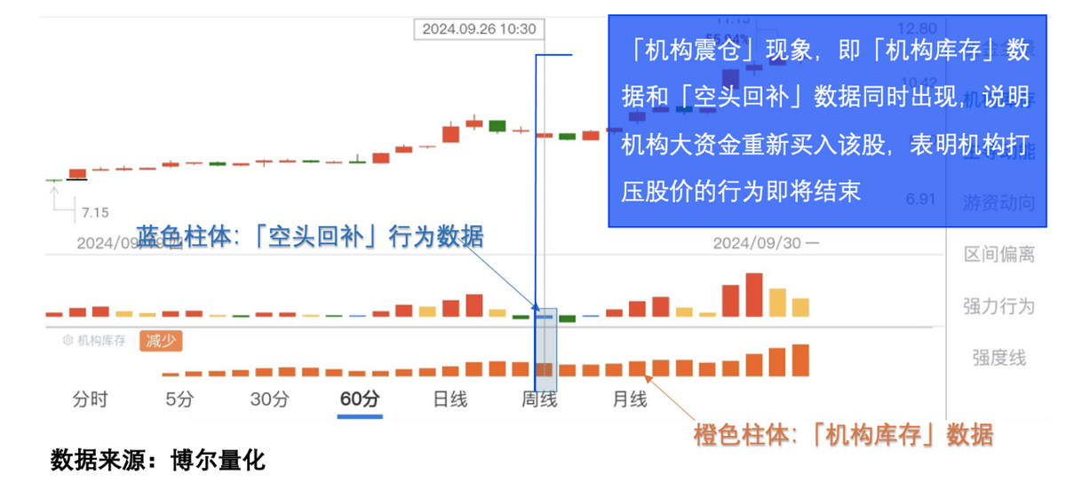 图中蓝色柱体则是反映当天交易行为的「主导动能」数据中的一种:「空头回补」数据,「空头回补」数据反映了前期做空资金重新买入的行为,实际就是补仓行为,如果同时出现「机构库存」数据,那就说明是机构在补仓,显然这是机构打压股价,调整结束的信号。