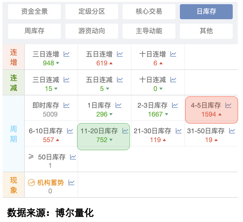 图中橙色柱体就是我用了十多年的大数据系统中反映机构资金活跃程度的「机构库存」数据,「机构库存」数据反映了机构资金交易的意愿,如果「机构库存」数据越活跃,那就意味着参与交易的机构资金越多,机构资金参与的时间也越长。