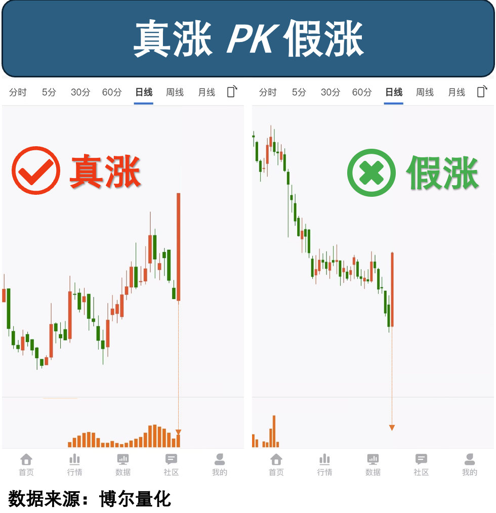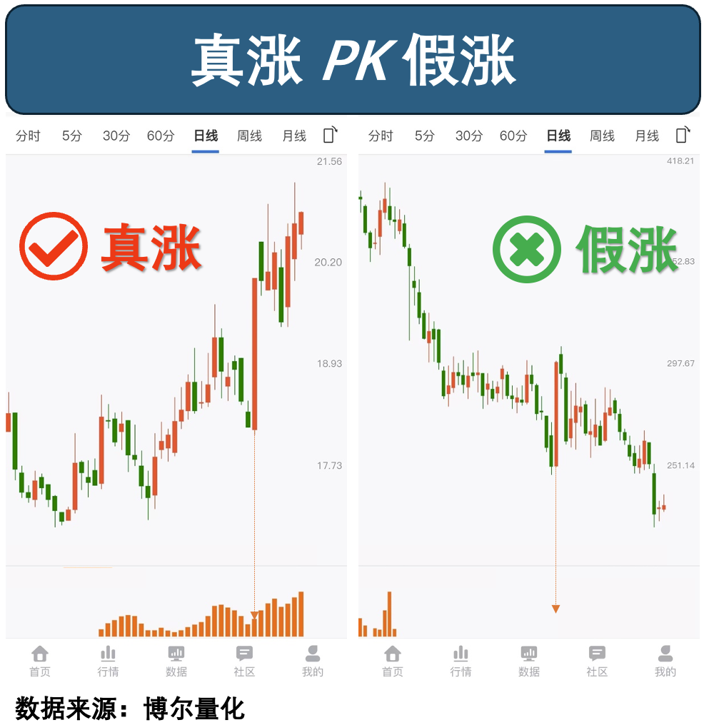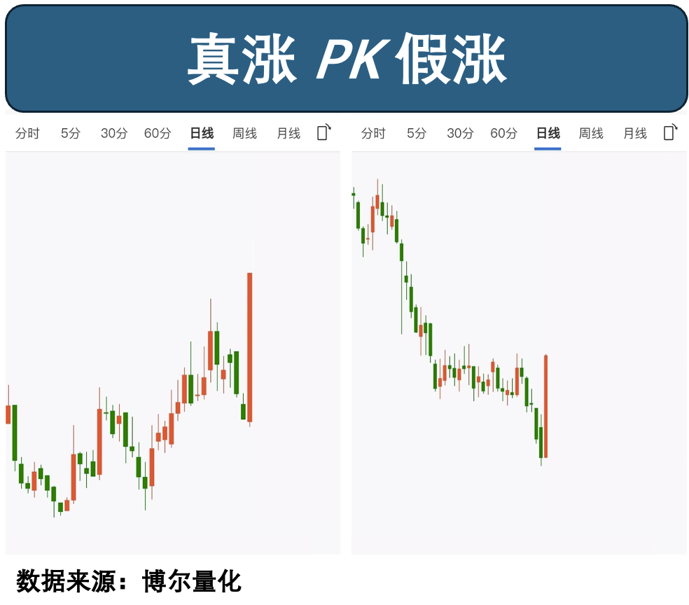 所以左侧的股票,反弹过程中,机构资金积极参与,所以是「真涨」,相比之下,右侧的股票,反弹过程中,并没有机构资金积极参与,所以是「假涨」。我们来看看结果,又会如何?